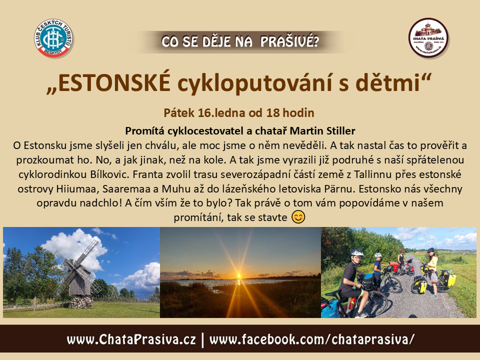 O Estonsku jsme slyšeli jen chválu, ale moc jsme o něm nevěděli. A tak nastal čas to prověřit a prozkoumat ho. No, a jak jinak, než na kole. A tak jsme vyrazili již podruhé s naší spřátelenou cyklorodinkou Bílkovic. Franta zvolil trasu severozápadní částí země z Tallinnu přes estonské ostrovy Hiiumaa, Saaremaa a Muhu až do lázeňského letoviska Pärnu. Estonsko nás všechny opravdu nadchlo! A čím vším že to bylo? Tak právě o tom vám popovídáme v našem promítání, tak se stavte